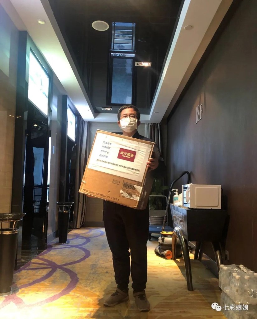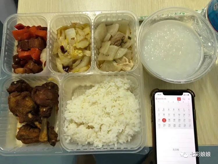 我们医院里头提供三顿饭,酒店里有提供三顿饭,还有很多捐赠吃的这些物资,吃起来肯定是足够了。味道也没什么好说的,都是盒饭。有几天,因为武汉市现在是严厉的交通管制等等,物资采购困难,酒店也非常难。有的是集中配送饭,有的是酒店自己做。有几天,肉食品少了,荤食品少了,鱼是更少。有一次的荤食品,就一只牛蛙腿,我说腿也是肉啊,你给我牛蛙脚趾头也蛮好了,是吧。后来就悄悄呼吁了一把,一呼吁不得了,真有能人就给我送肉来了。反正现在好心人士不少,各显神通,你有办法就搞。后来又送鱼,我在朋友圈里发过照片。有鱼,有肉,有罐头,午餐肉罐头,还有香肠,大红肠。他们都送过来,大家开心极了
