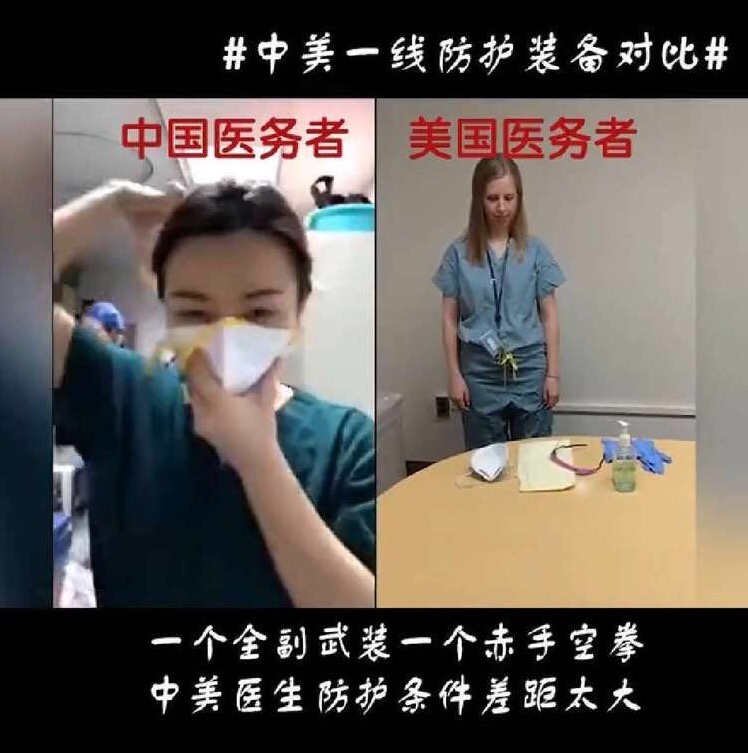 所以这次每个中国人做得都很好。大家都设立了一整套的防护方法,而且互相交流。一般的小区的防护不比美国的医院的二线人员的防护差。那中国的一线医护人员呢,做得就是非常非常好了,中国的一线医护人员可以说是飞机加大炮,美国的一线医护人员的防护,也就是小米加步枪。下面的视频截图是“视觉志”做的比较中美一线医护人员装备的视频,可以看出,中国医护人员是按照生物战的水平防护的,美国的医护人员是按照普通流感或者肠炎来准备的。美国医护人员的装备薄如蝉翼,还不及我们平时手术室的装备。都这个时候了,CDC是不是要求业务人员的装备至少是手术室水平的防护啊?