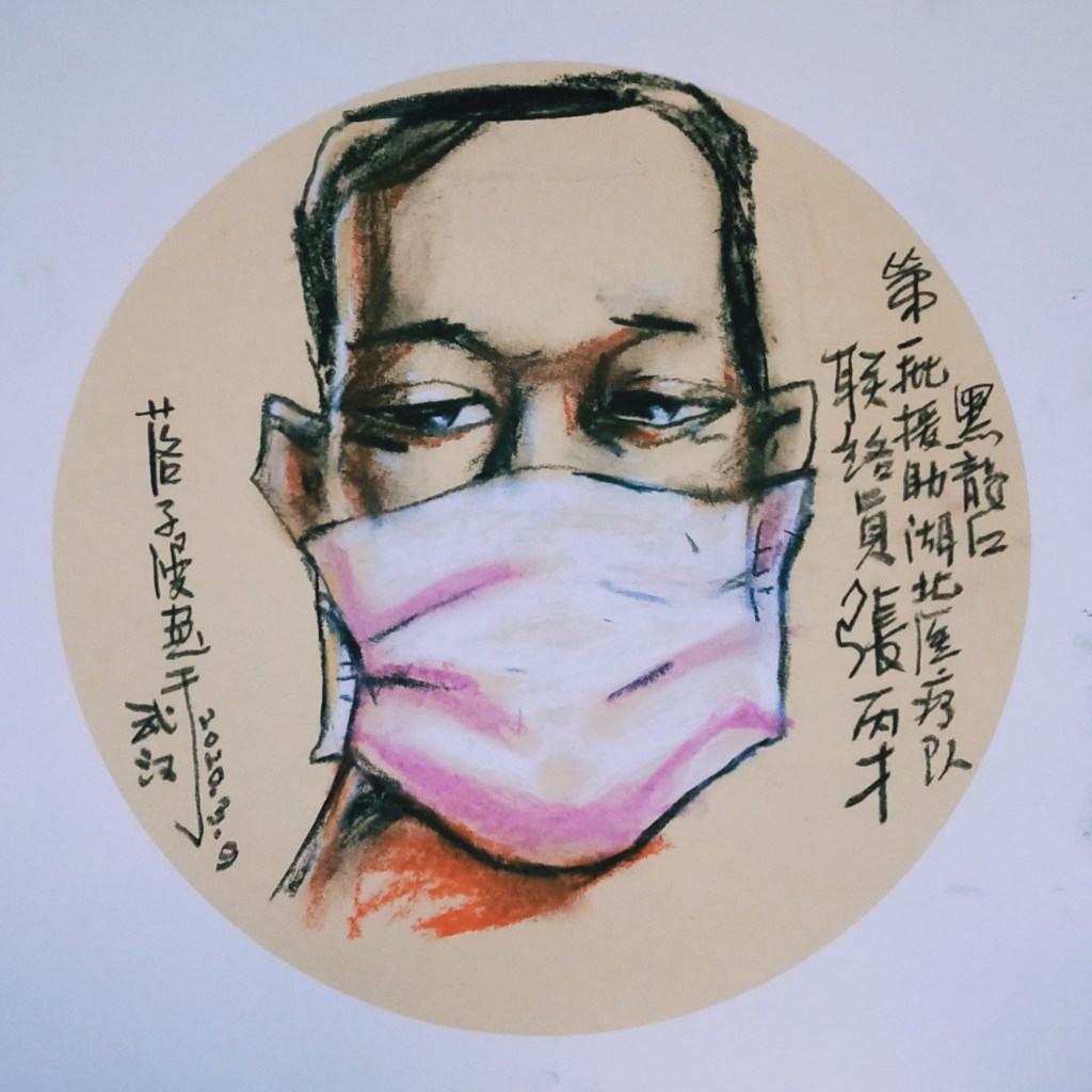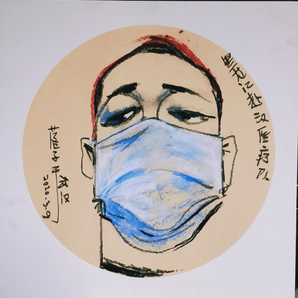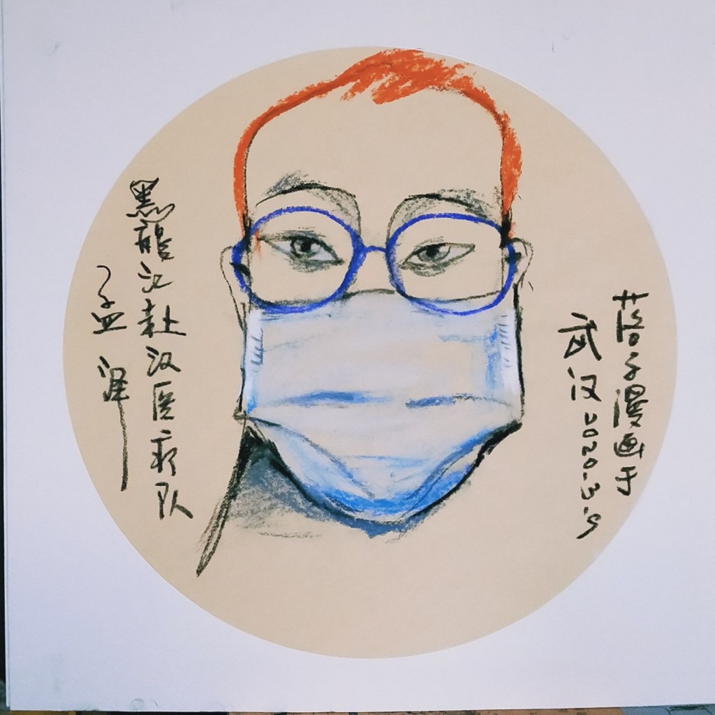 “落子的准现场漫像。武汉抗疫期间,不获批准出小区,仅能以人物出视频作画,绝非画照片也。是为”准“。本人为落子写背景文字”肖像之相“,以示站台意。”