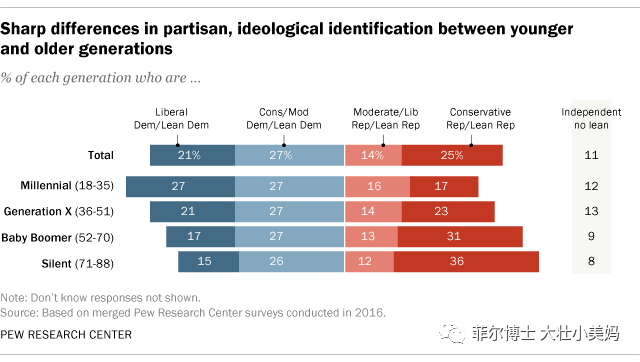看看美国民主党(自由派/liberal)和共和党(保守派/conservative)的年龄分布,似乎这个年龄分层确实在一定程度上存在。