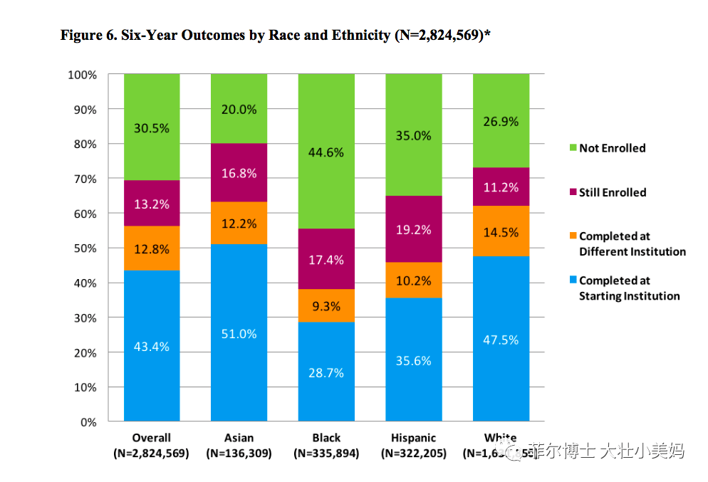 由图可见亚裔的毕业率(蓝色+橙色)最高,63.2%;白人62%;非裔38%。所有被大学录取的非裔学生,只有不到40%能毕业。剩下的那60%非裔录取生没有大学文凭。