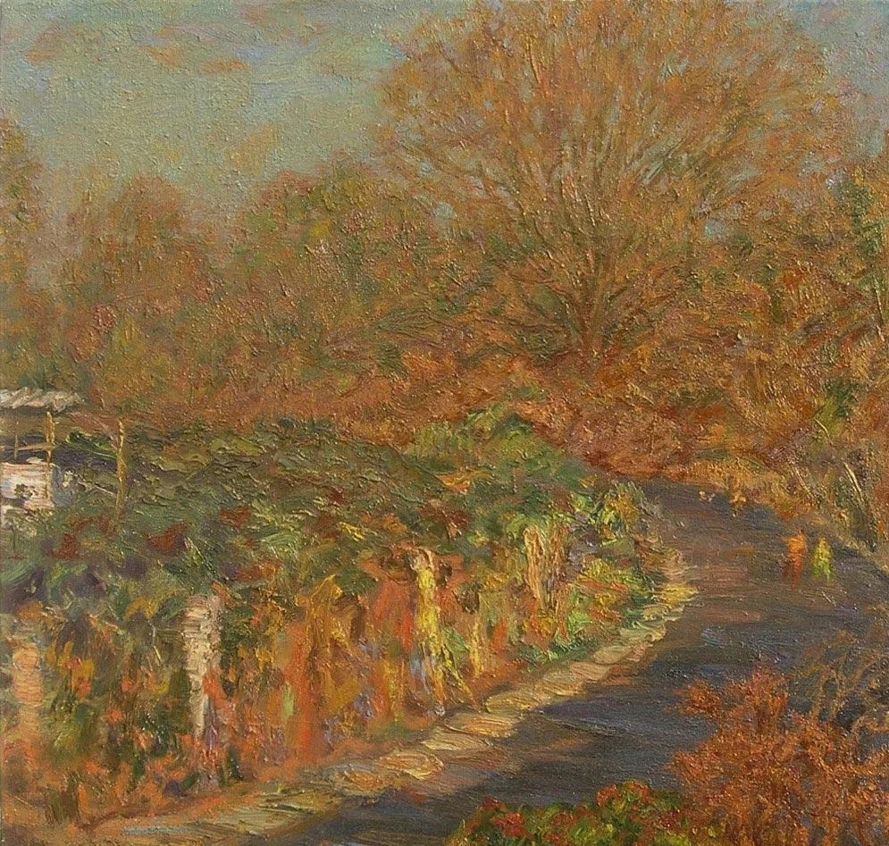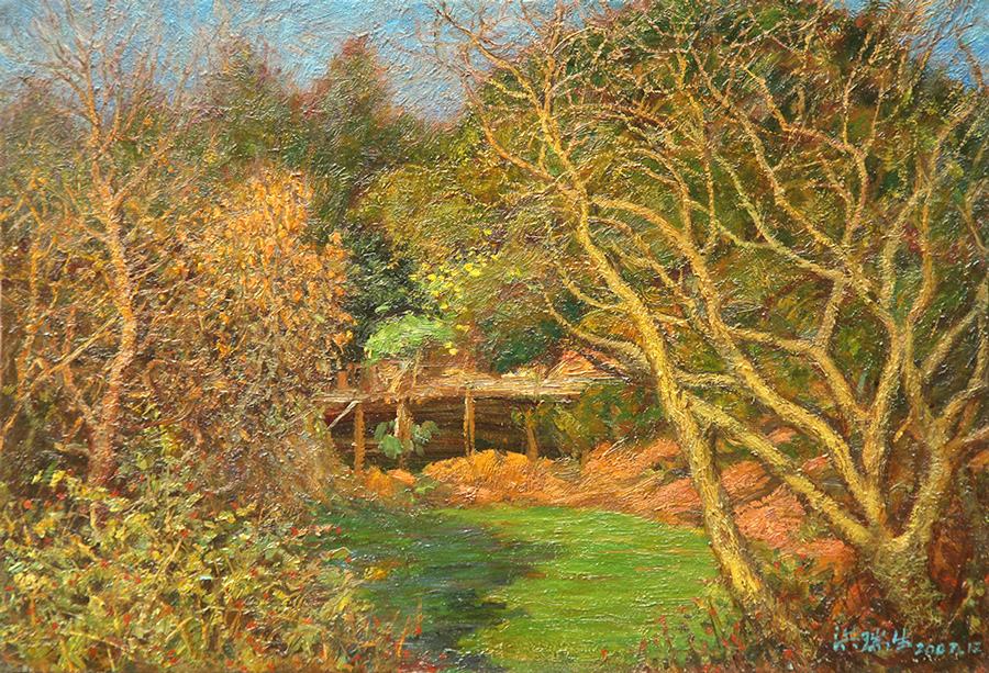在《初冬》(2007)和《郊野孟冬》(2006)作品里,画家高超地将冬日的阳光处理成金土黄、桔土黄与棕褐构成的基调,草绿、橄榄绿因被这种暖色浸润而成为极为精致的暖灰绿,尤其是树稍边缘的黄褐色与树干背后的红棕色,更增添了画面的光照感与透气感,小笔触米点似的点堆也使画面越加浑朴与厚实。土黄和棕褐还构成了画家表现闽南红土地与民居的基本色相,加之较为饱和的天蓝和深绿色植被,似乎也再次演绎了画家从表现鼓浪屿的海景所形成的固定色彩配置,只是这三种色彩谱系在画面的比例发生了相应变化而已。