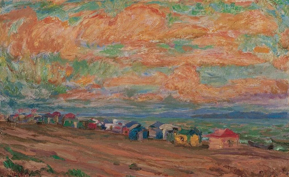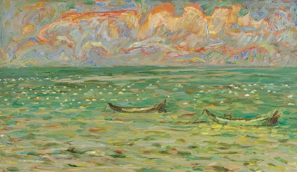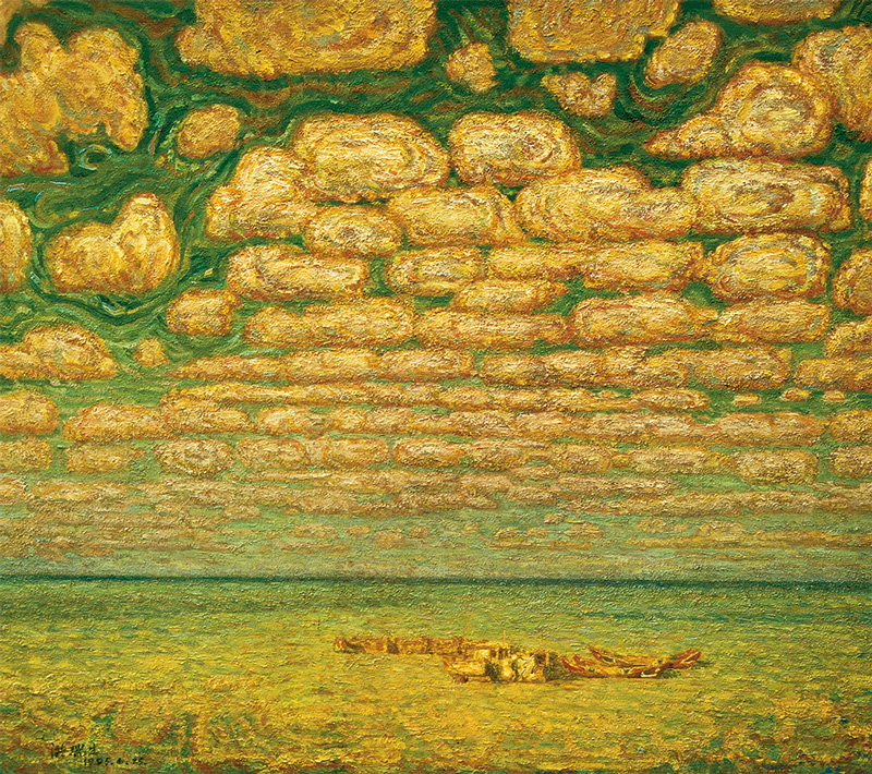 他的《平静的海》(1995)甚至于把大片的朵朵白云都变幻成夹杂着茜草红和深棕的厚实的土黄光色,天空与海面则被大胆地夸张为橄榄绿、土绿和绿褐,这种变奏其实正是他的阳光色彩谱系形成后的一种对象化。
