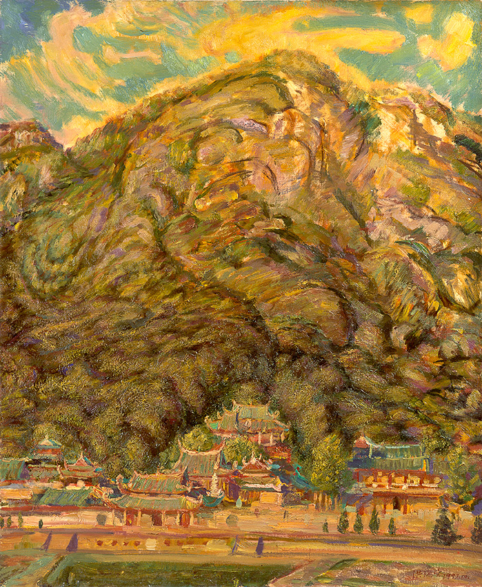 《山》(2001)、《云顶岩上的果林》(2001)和《厦门南普陀寺》(1993)等也都是这样。这几幅画作,均以土黄色系构成岛屿山岩的主体色相,天空的普蓝、橄榄绿因用土黄、深褐调整而相应变得沉暗,岛屿上的树木也被土黄、生赭和深褐所抑制,而画面最深的色彩则是熟褐中带着的茜草红,从而给人一种炽热色温的深刻印象。