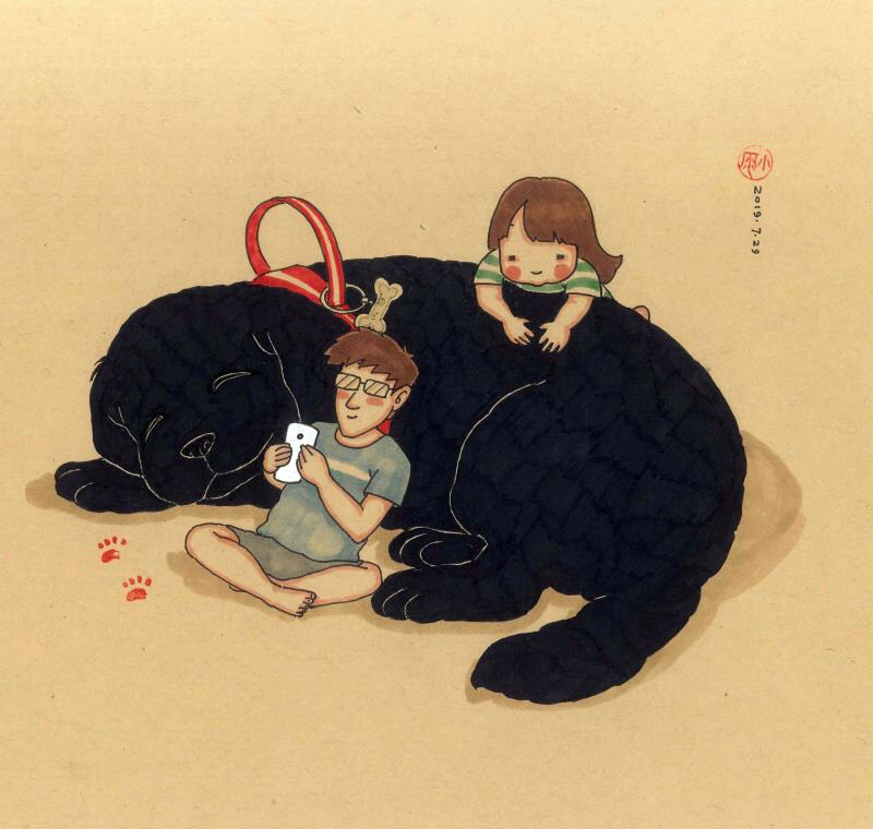 小白,一只黑黑流浪狗,是小雨家庭中的一员,收养多年了,性格也随小雨,那眼神,那动作,都酷似一个容易受伤的小女孩,小雨这篇疫情中的组画,也是小白狗眼看人低,低到了尘土里的小小男女家长里短中的疫情时代小故事。
