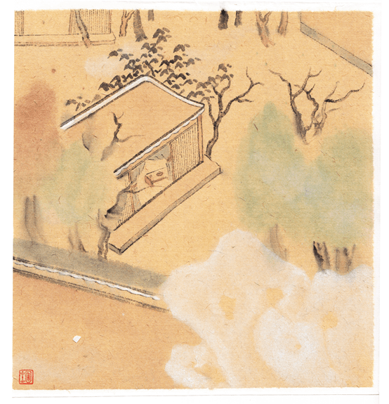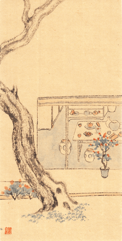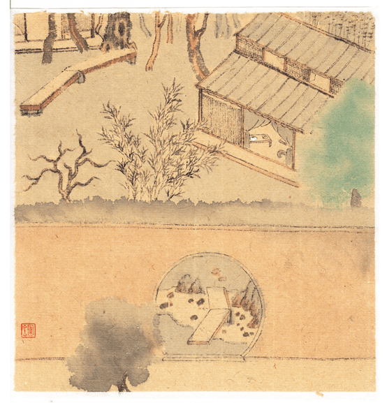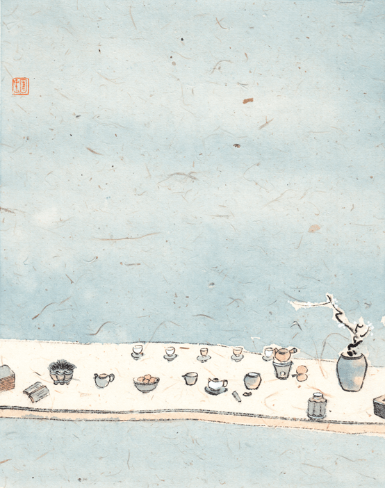 一张黄色的毛边纸,再裁成数张,每张纸再画了身边的一角,或杯碗厨具,或壶盏茶器,或笔砚文房,或墙角干花,或桌上一叠书籍,或屋檐下一盏灯笼,或地板上一只猫咪。当这些藏在城市角落里的物什被笔墨铺呈在纸上时,顿时浸染上一股雅致和清幽之气,亦苍凉亦幽深,留给了观者想象和绮念,如泛黄的老照片,还喜欢他笔下的园子,但你不一定能指出是哪个园子,因为这园林已不是一个地缘概念,更是一个人文空间,唯美,典雅,深藏于作者的梦中:竹篱茅舍,石屋花轩,松柏群吟,藤萝翳景;流水绕户,飞泉挂檐;烟霞欲栖,林壑将瞑……