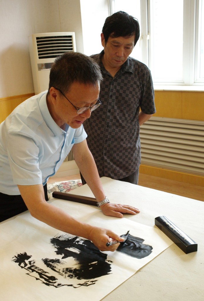 一段时间,受之在临摹李可染的山水。“李可染的山水墨色厚重,但墨彩华滋、钟灵毓秀,用笔如锥画沙,善于采用逆光的感觉。”他边画边介绍。