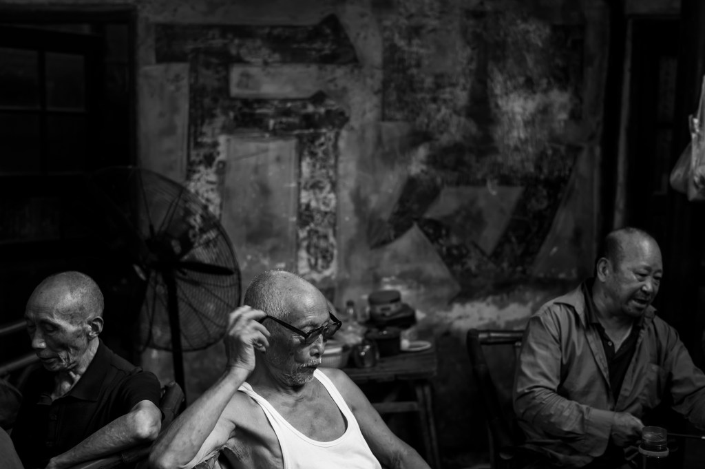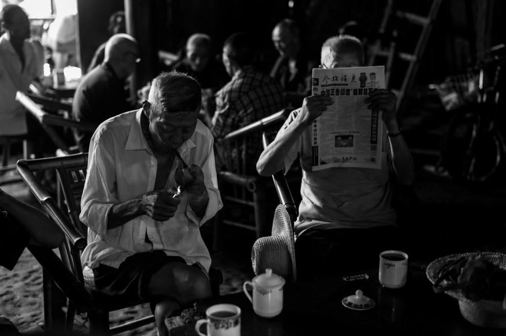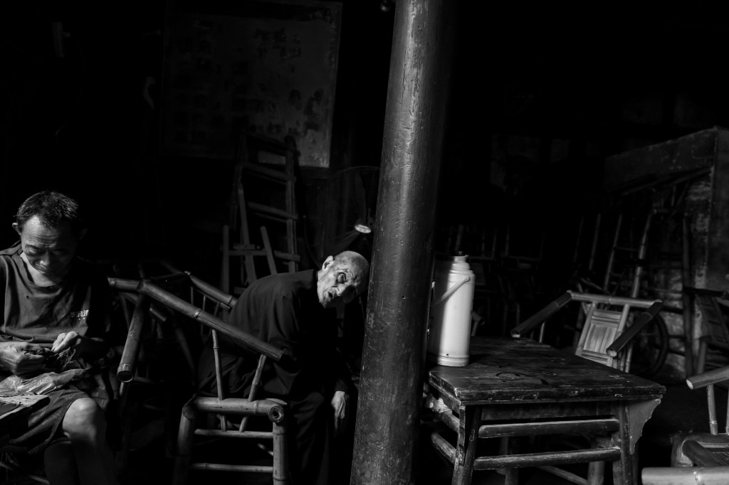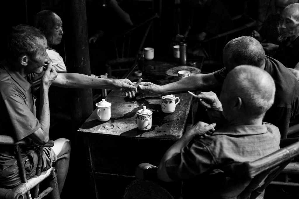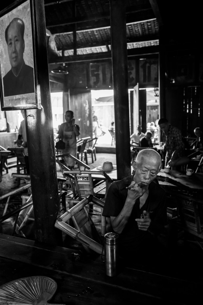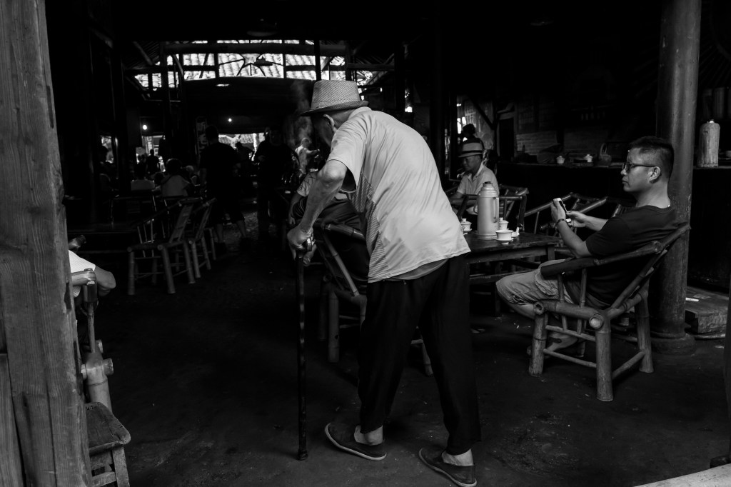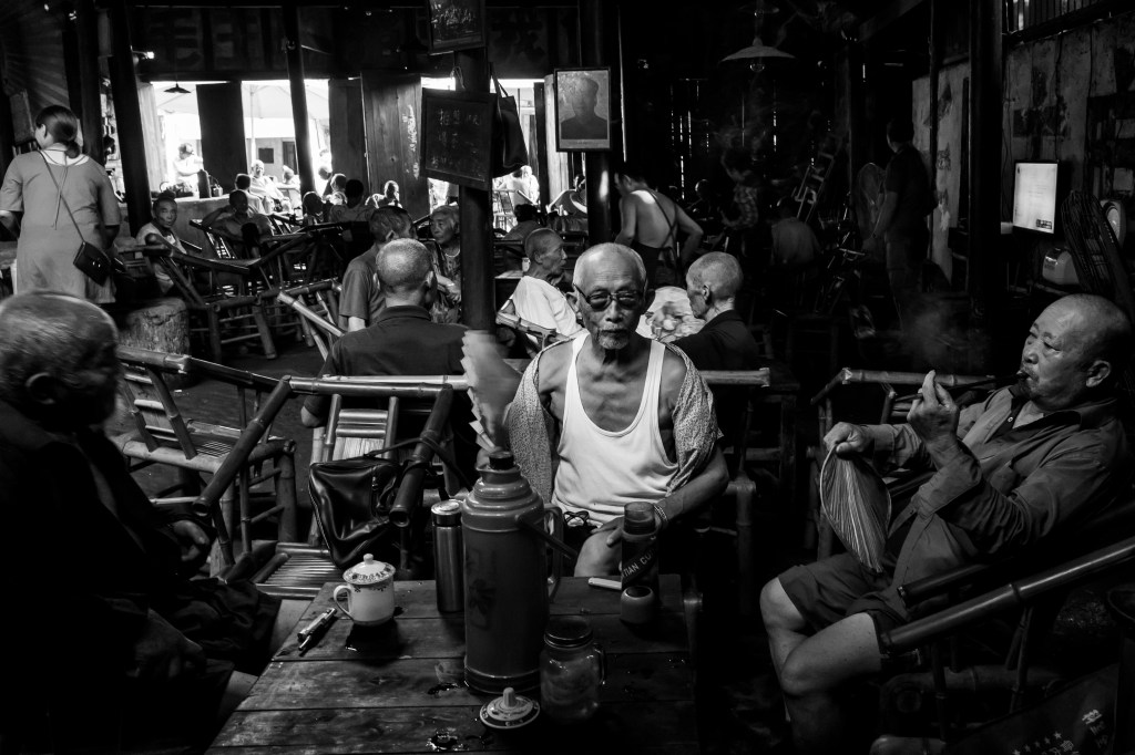 上午9点左右,慕名而来的摄影人基本都慢慢离开了,喧闹的茶馆此时才会慢慢安静下来,回归到四川茶馆本来的面目。这时也能清晰地听到茶客的招呼声:“老板,加点水”,“要得”。