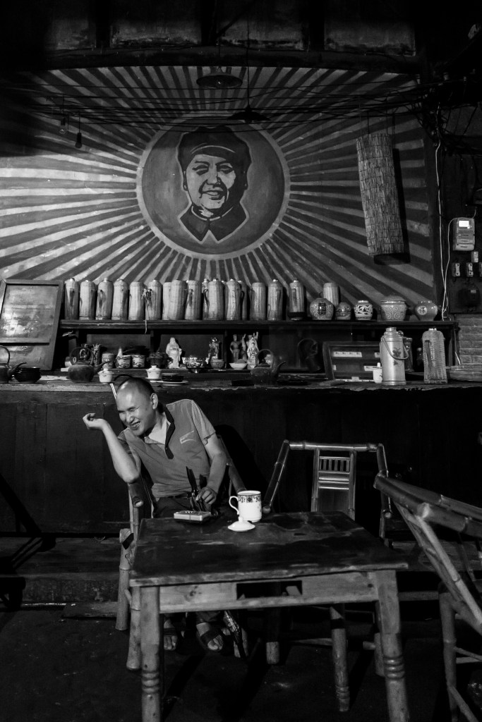 据说这座茶馆在文革期间被当时的革委会征用,茶馆里遗留着大量文化大革命的文物,墙壁上到处书写着文革时期的标语,进门就能看到醒目的祝毛主席万寿无疆的标语口号。也正因为如此,这座茶馆现在变成了远近闻名的摄影圣地,每天吸引着无数国内外摄影爱好者的到来,有时摄影的人比喝茶的茶客还要多。