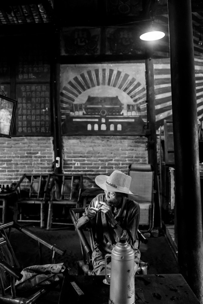 我天没亮就来了,也不记得是第几次来这里了。反正只要是路过成都,基本都会来这里找个角落坐上一会,随手拍点自认为还行的照片。其实也就是记录一下当地茶客们在这里喝茶的一种状态,一个人的、几个人的都拍。借用墙壁上文革遗留的标语口号等历史元素作为背景,来突出它与别的茶馆的不同之处。来这里是喝茶还是拍照,我自己都搞不清楚了,反正茶也喝了,照片也拍了。