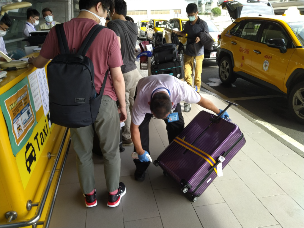 提取行李之後,前往搭乘政府規定的防疫計程車,旅客都自動保持社交距離耐心排隊等候。服務人員要求先查看健康憑證,再用消毒酒精噴灑旅客及行李,真是步步不敢輕忽。防疫計程車公佈的車資價目表,苗栗1,000 元(新台幣),最貴的是台東3,500 元,其餘的應該是政府補助,台北及我居住的新竹均未列示。