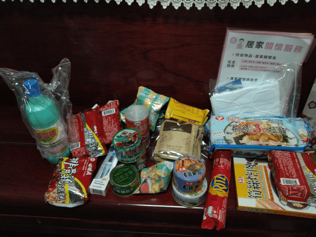 接聽里幹事電話是居家檢疫每天必做的功課。第二天(6/7),到了十點多,都沒有接到里幹事的關懷電話,覺得蹊蹺,打開手機,才發現設定成靜音,趕緊主動回撥,免得警察上門。下午二點左右里幹事送來關懷包放置門口。我們保持社交距離,我戴著口罩點頭連聲道謝。關懷包內容豐富,計有:溫度計一支、口罩一包、排骨雞湯麵三包、柴魚拉麵一盒、筍絲扣肉一包、餅乾數包、罐頭六只、鹹或甜的小吃一包,即溶咖啡七包、垃圾袋一捲、漂白水一罐等等。我將其拍照,並分享給家裡的群組,感謝市政府的體貼關懷。