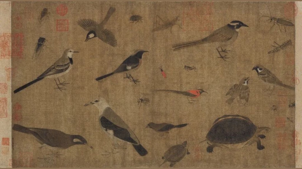 S:是的。如果说上一个节气是紫气东来、春风化雨,这一次便是春雷乍动、电光火石的节奏,“蛰虫惊而出走”。作为黄筌课子稿的《写生珍禽图》中,既有纤弱的昆虫、跃动的鸟雀,也有坚忍的灵龟,可谓格物致知,“夺造化而移精神”。物种或稀罕或寻常,却是众生平等、各自珍贵,拥有不同的时间维度、生命周期与存在意义。又似乎每只虫鸟都有说不尽的诗词典故,文化象征与哲学意义。