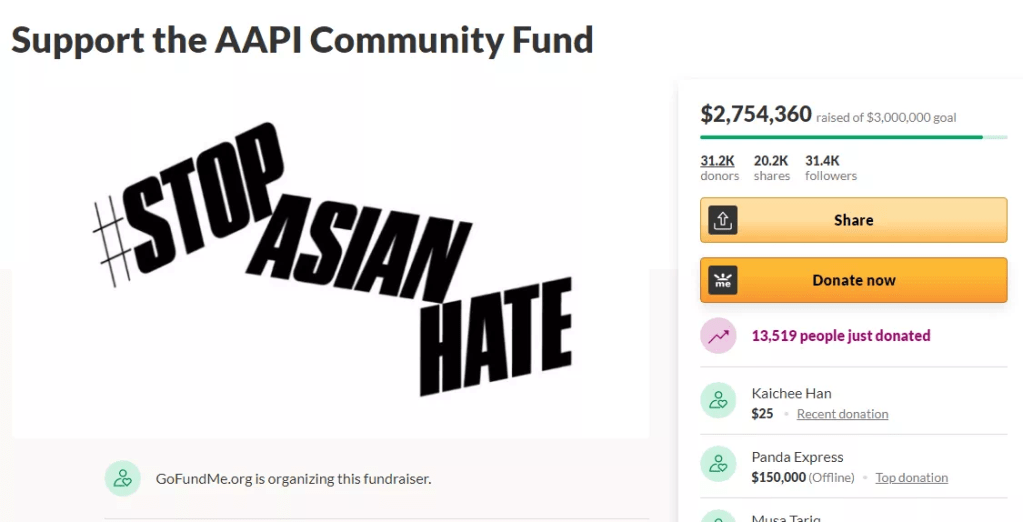 AAPI Community Fund 也迎来捐款高峰,募捐总额已经达到270多万美元。其中美国著名中餐连锁店Panda Express捐款15万美元,著名服装商店H&M捐款10万美元。