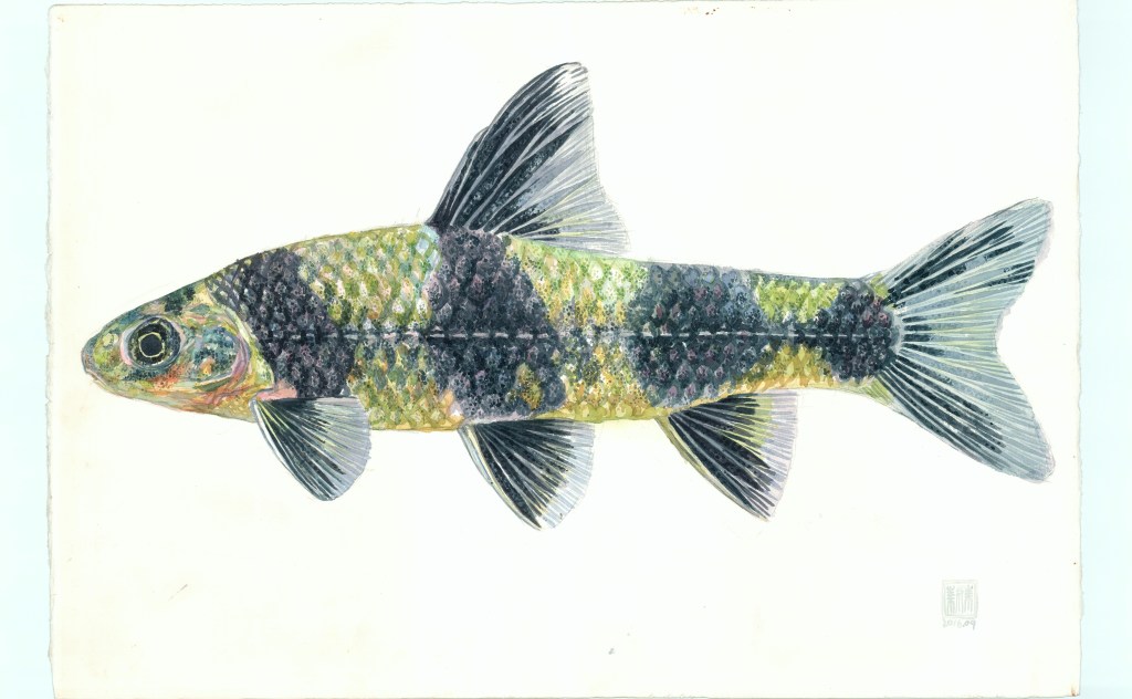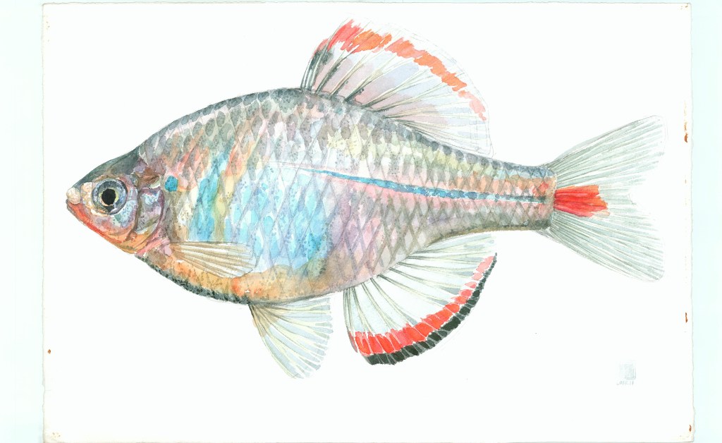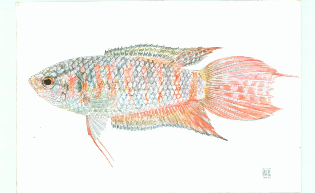 所有原生鱼,虽说脱离了水系,脱离了衬托的背景,脱离了游动的形态,但只要你静下心来,细致入微地进行观察,你就会发现,这些静态的孤独的不动的鱼依旧是鲜活的,是具有生命力的,它们的鳞片和鳍散发着生命的光泽和动人的光彩,尤其是那些形态奇异的鳍,慢慢放大去看,仿佛能感觉到左右旋转的力量。