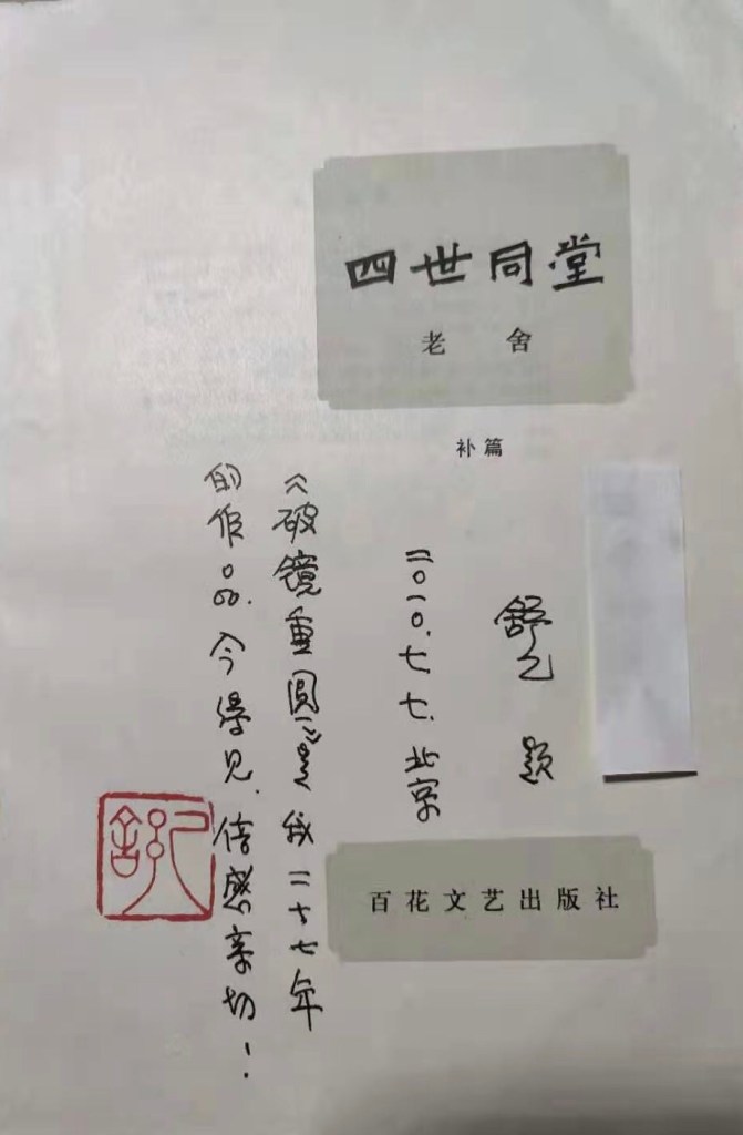 上部、补篇到手,加之前购下部,一套《四世同堂》终于“同堂”了。抚摸良久,思之再三,我决定将书寄给远在北京的舒乙先生,附信告知三本书“同堂”的趣闻,并拜请题跋、签名、钤印。书寄出了,我又忐忑不安起来,对一个素不相识读者唐突而冒昧的要求,身兼多种社会职务、诸事缠身的老人能圆我的梦吗?