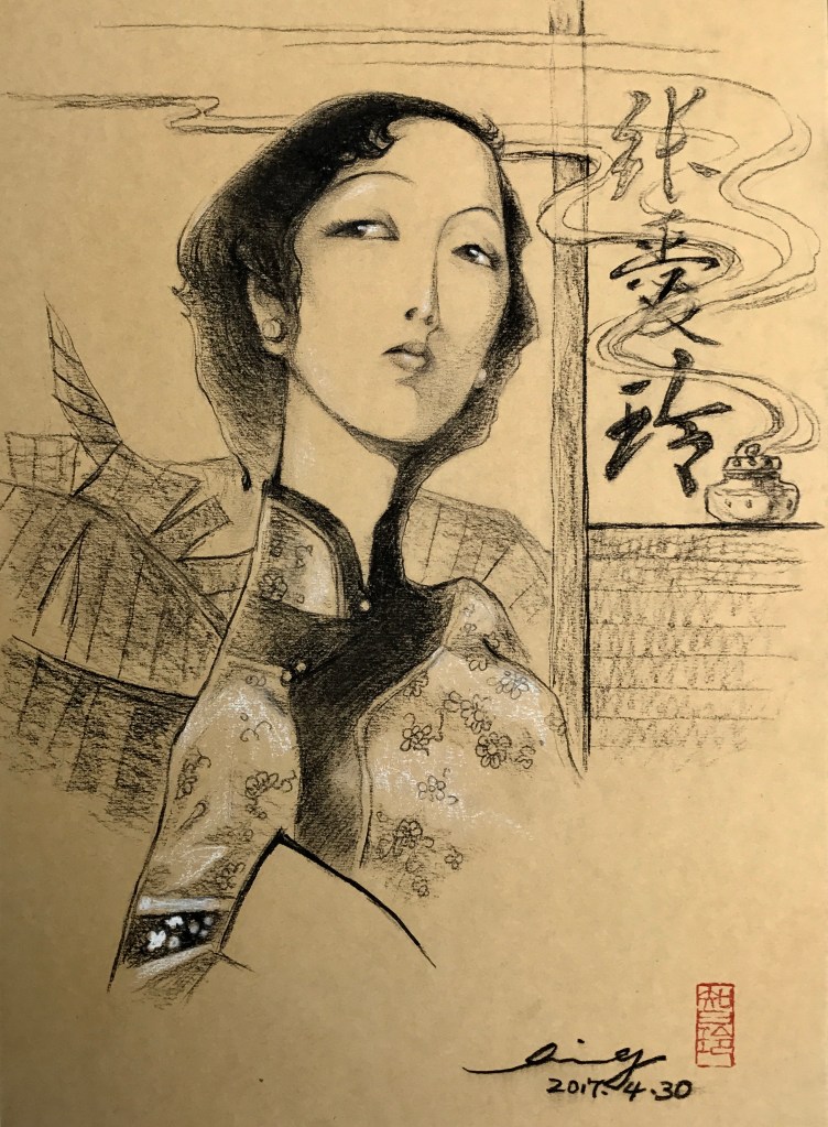 2018年,我的肖像漫画作品《张爱玲》在首届中国国际肖像漫画大赛中进入前30名获大奖,并在北京嘉德艺术中心展出。