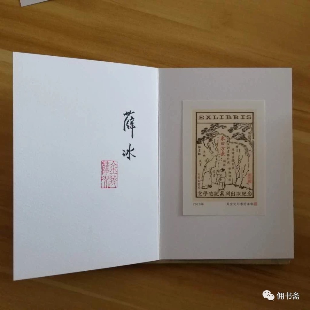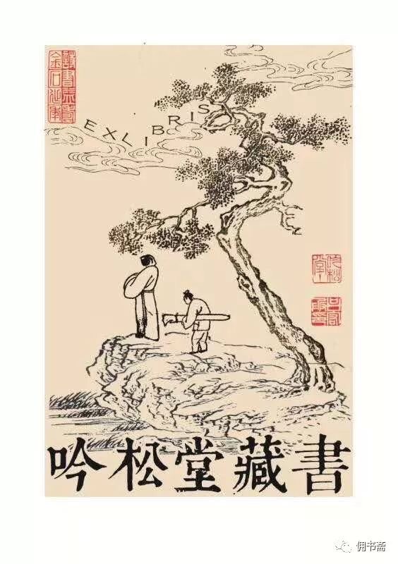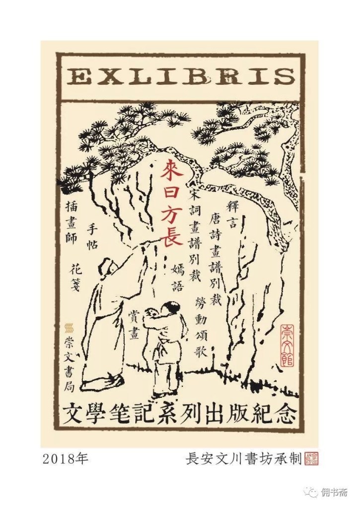 米黄的底色,有边框枯笔墨线,像古代版刻,颇显古意,人物有二,一书家举臂题壁,与一侍砚墨童相对成趣,暗示套书出版,意在提倡书写。摩崖壁面书名安排错落有致,书名本来直白,并不稍事含蓄,体现套书十册,内容多为中国传统文化,如诗词、书法、版画、花笺、手帖、戏曲绘画与唱词、线描佛像与禅语、中外绘画的赏析图文。与人物挥毫、侍砚动作结合,体现出套书内容可赏、页面可写的特色。左下角是崇文书局logo,右下是一枚“崇文馆”押角朱印。崖壁正中题“来日方长”红色四字,正是套书系列名。其实人生苦短,来日虽然可待,去日奈何良多。如若有人凭借一册(或多册)精美笔记,读赏美图好字,有若面对美食而“食指大动”,一时兴来提笔,或写日记,或作笔记,或画速写,随手记录生命点滴,雪泥鸿爪,乃至生活悲欢,真情实感,甚或雁来鸿往,山水之乐……在电脑普及,传统书写似乎日暮途穷的今天,这已是非常隆重地善待自己的岁时生命了,也不啻古人镌字勒石、“藏之名山”或“传之同好”。这枚书票中的“来日方长”意念,是通过摩崖石刻和虬然古松的意象来表达的,既表达的是鲁迅先生所谓“纸墨更寿于金石”,也表达赵家壁先生所谓“书比人长寿”。我在冷摊得来的丛残中,有一地主日记中写的颇为工整的联语,上句为“纸墨千年会说话”,见于1948年初,一支南下武装干部工作队的队员日记。却原来,懂得纸墨和书写之可珍贵的,不仅是著作家和编辑家而已。不消说得,积极投身爱书文化,广结书缘,既擅制书票,也擅制笺谱的文川先生也深自懂得,于是有此佳票出焉。