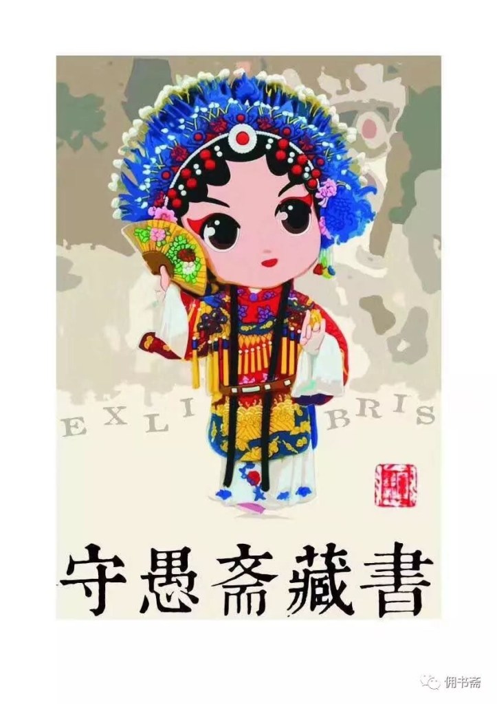 观赏文川先生的藏书票,虽不乏“拿来主义”、对西方书票有所借鉴的作品,但堪称佳构的,还是那些具有中国木刻版画特色的作品。如《守愚斋藏书》票,一小女孩扮花旦持花扇造形,工笔细致,但又似水粉,正是“霓裳霞帔步摇冠,钿璎累累佩珊珊”,体现了票主戏剧工作者的身份。人物巨眼炯炯,有思无邪。背景却好似水墨写意,设三重色,从下至上,由浅渐浓,意为“云山几盘”?拟或“江流几湾”?
