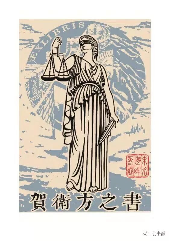 《贺卫方之书》票,堪称中西结合的善制。画面无边线,显得广博宏大,前为西方司法女神造像,黑色线条,身姿略侧,颇显力度,身后圆型构图,浅蓝设色,是中国古长城,藏书票的规定标识字母以弧状呈现于左上,再后,蓝色更浅,几近于灰,则为大地山川江河,充塞天地之间。票主是学者,作中外司法比较研究,票中体现的、想要表达的、画面暗寓的,是不言自明的。