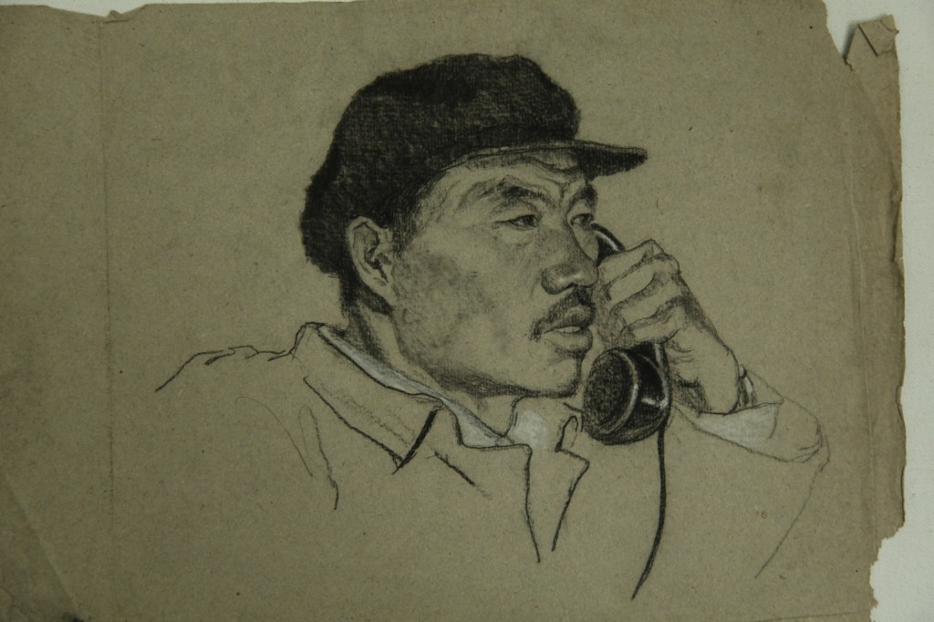 “记录与刻画”,都是七十年代以前的速写,最早的是那幅正在打电话的公社书记,那是在央美大一时到北京郊区官厅水库花园公社劳动锻炼时画的。其余就不一一细说了。