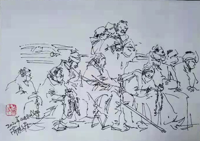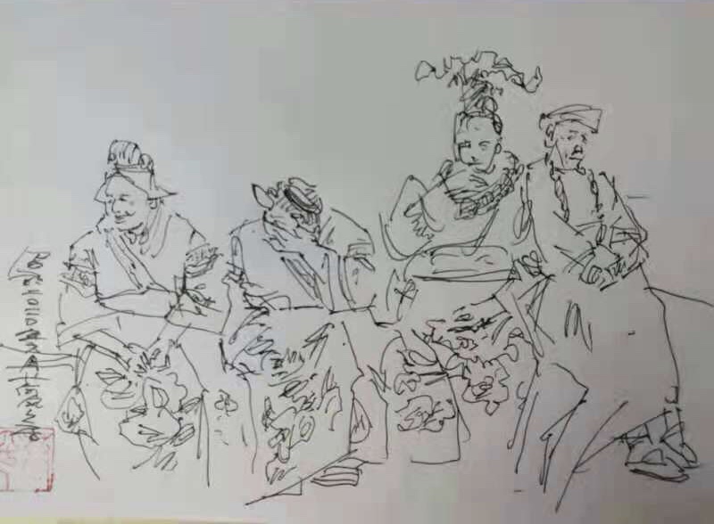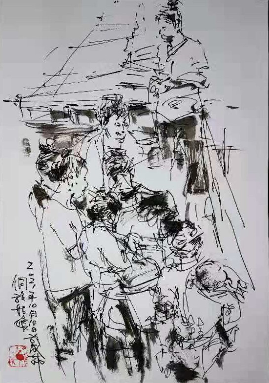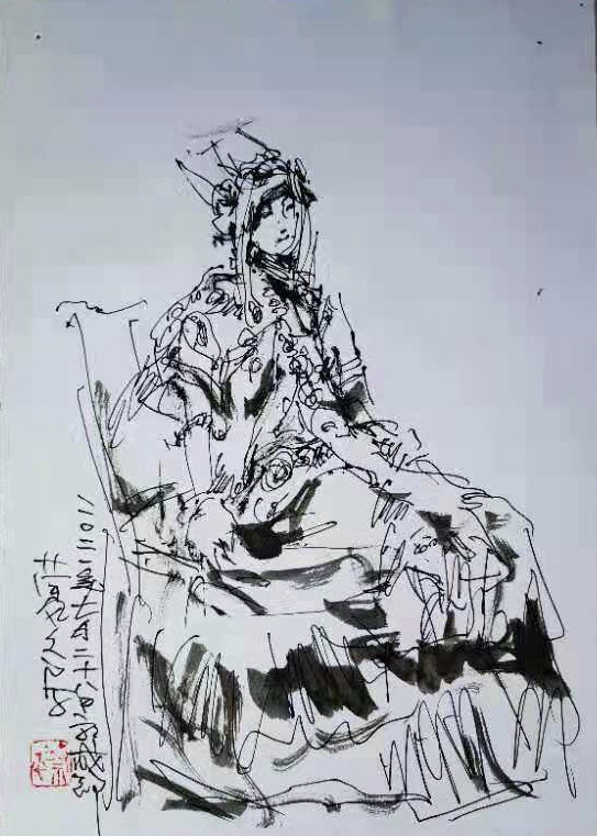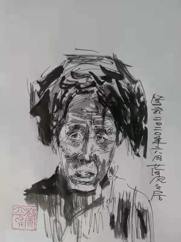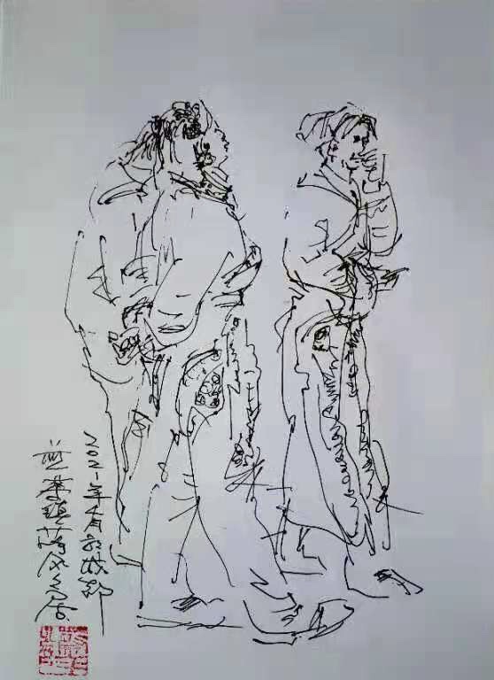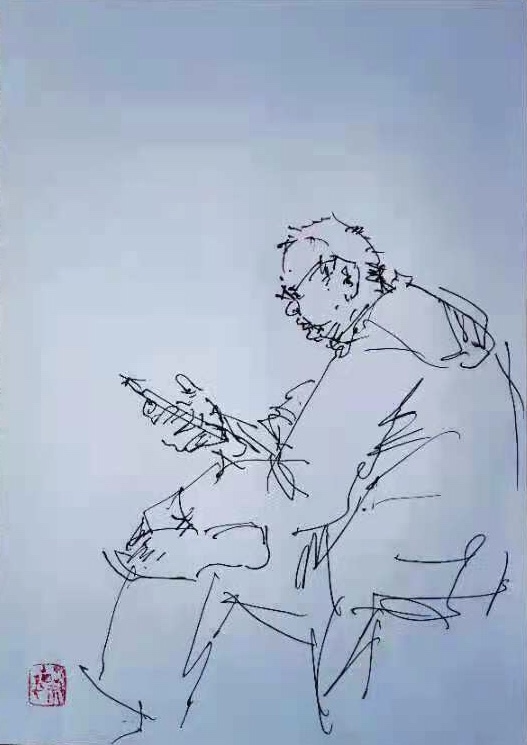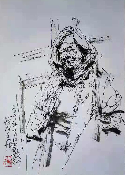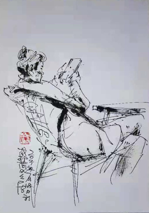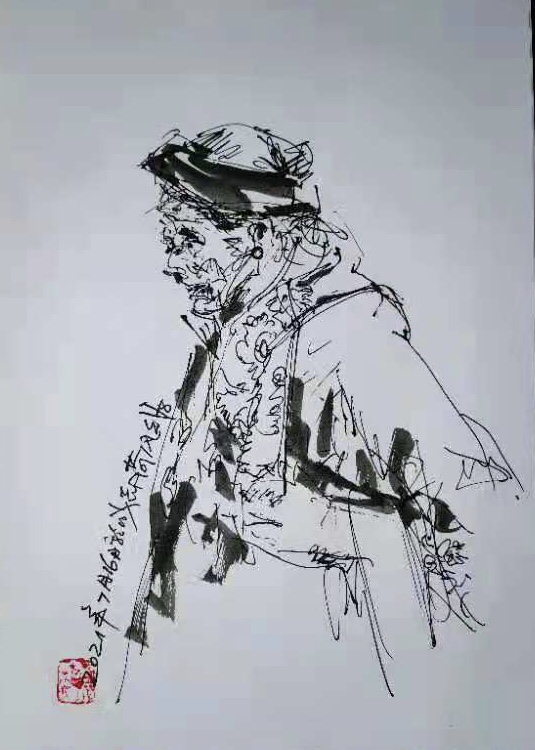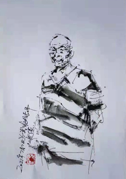 6月的天气,骄阳似火,人就象掉进了蒸锅里闷的难熬。只好躲在家里画些速写,用毛笔和钢笔结合自己绘画特点,随心所欲地画,描绘人物及场景,运用黑白灰、点线面,浓淡相宜巧妙结合处理,画出了一些还算满意的速写作品,但离要求很远,继续行走在探索的路上。