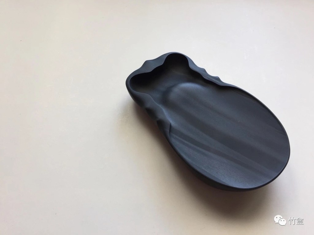 砚有骨,在线、在形、在质;砚有神,在气韵、在品格、在一个落潮,一段弧线、几分比例、几分厚薄。观子安所造之木叶、钟形、幽兰、佛豆诸砚,皆近于完美。