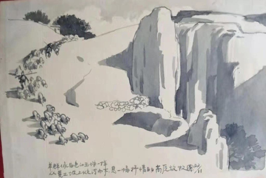 他说他在西北各地画的速写累积了几大纸箱,许多都成了他后来国画创作的素材。文革中他身心饱受摧残,1982他再到甘、藏采风时腰疼直不起來,就跪爬在草地上画速写!当年我省博物馆会时我为他画了速写像,他高兴地簽名留念。
