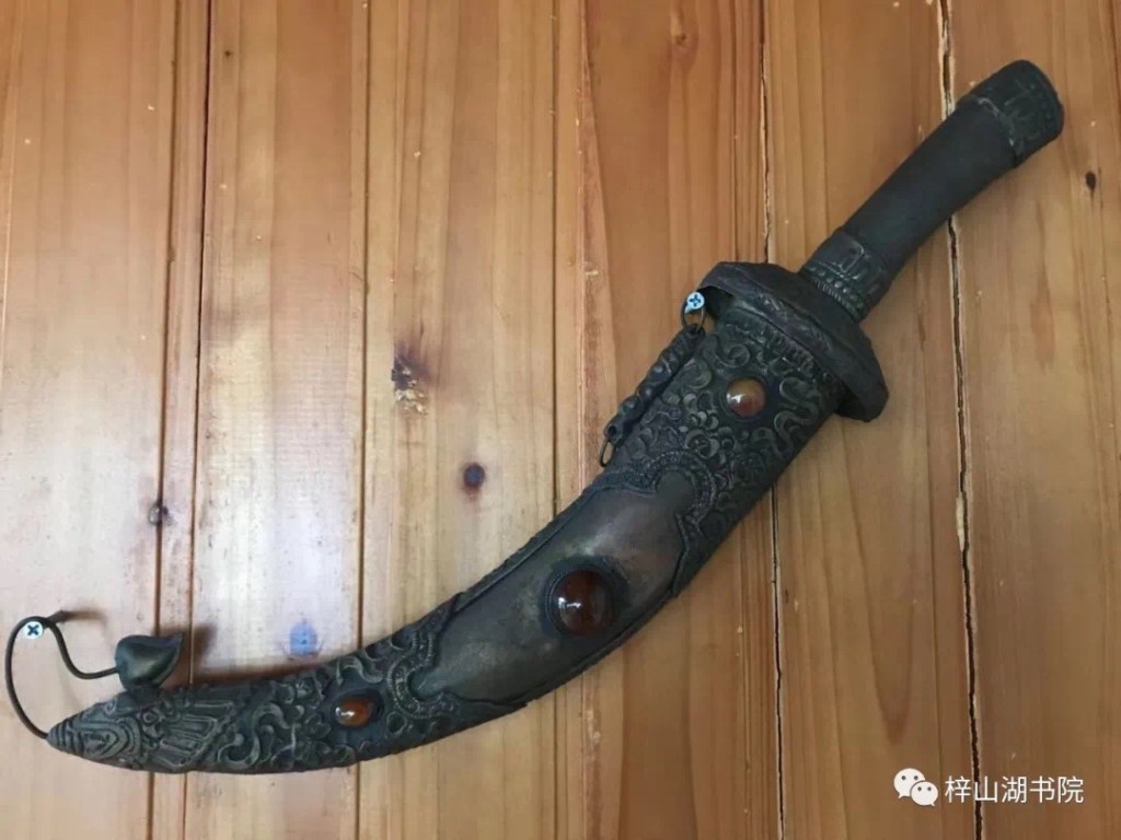 那时余三十出头,正值血气方刚年纪。虽一向身体羸瘦,手无缚鸡之力,却常有不平之心。翌年,余“相助拔刀”,落得一柄铜鞘弯刀。周日,余去汉口江滩花鸟市场闲逛,彼处文物贩子和企图捡漏淘宝者挤肩磨踵。先是,一黑脸壮汉着藏服却满口北方汉人腔,举一柄带鞘弯刀厉声叫卖,声称祖传宝刀,要价五百。一看客羡慕,接刀观之,刀长二尺许,铜鞘锃亮,刀柄、鞘面镂有祥云图案,嵌彩石,造型精致,成色似有年头。围观者众,皆赞好刀。看刀客仔细端详后嫌贵,奉还卖家。卖家不接,催请看刀客出价,看刀客不语。卖家虎着脸咄咄逼人:“美人配英雄,宝刀识好汉,俺这把宝刀只认您了!四百可好?”