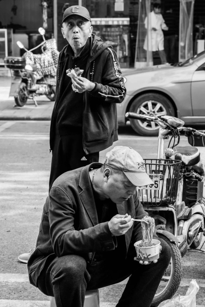 纪实摄影是以“人”为主要反映对象的,强调的是真实、客观地再现人的社会生活。真实性、客观性,是纪实摄影的生命线。在这个世界上,“人”的社会生活是具有差异性的。决定这种差异的,是独特的文化。在建忠的镜头中,武汉人的过早,是真实的,客观的,包括在街头路边过早的随意性,简陋性,以及周边环境的杂乱无章。但这种杂,或者杂糅,恰恰是武汉的特点之一,武汉是中原、荆楚、吴越、巴蜀四大文化风云际会的交锋点,在饮食上,是北方的面文化与南方的米文化的交汇点,是川湘之辣、江浙之甜、闽粤之清淡、徽鲁之厚重的交汇点。东西结合,南北杂糅,恰恰是武汉文化的特征。而武汉人过早的率性与随意,一方面是码头文化的浸润,更重要的,是楚文化的传承。