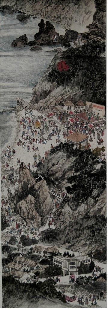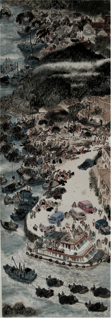 《渔家乐》条幅长卷从蓬莱阁起笔,绵延长山列岛32岛屿,直至辽宁老铁山收笔。各岛特色尽收眼底,美不胜收。长卷表现各类船只数百艘,其中涉及海水浴场、景点人流、庙会祭祀、集贸商贩、民间表演以及渔耕场面40多处,涉及人物近万,各类人物栩栩如生,生动活泼,很少有雷同之处。人物的组合和动态富有戏剧性和幽默感,构图疏密有致,注重节奏感和韵律的变化,笔墨章法都很巧妙。
