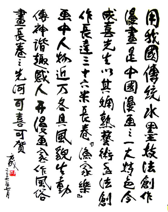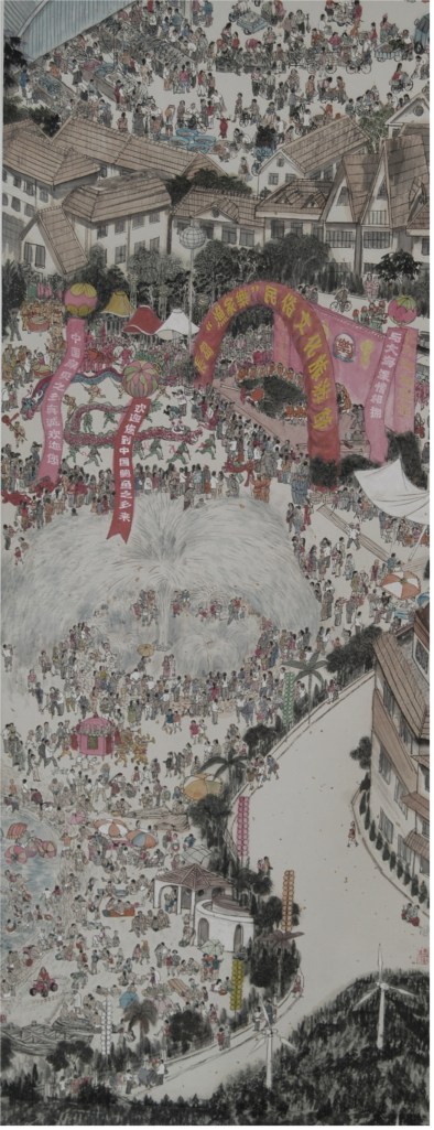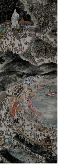 在现代美术史上,出现了许多既是著名漫画家也是国画大家的现象,诸如叶浅予、张仃、黄永玉、韩羽等等。漫画家的思维往往与众不同,特别是作品中的幽默趣味,常常成为他们作品中的亮点。观成喜的长卷作品,笔下的近万个人物夸张有度,情趣盎然。这与他常年累月数以千幅的漫画创作分不开。