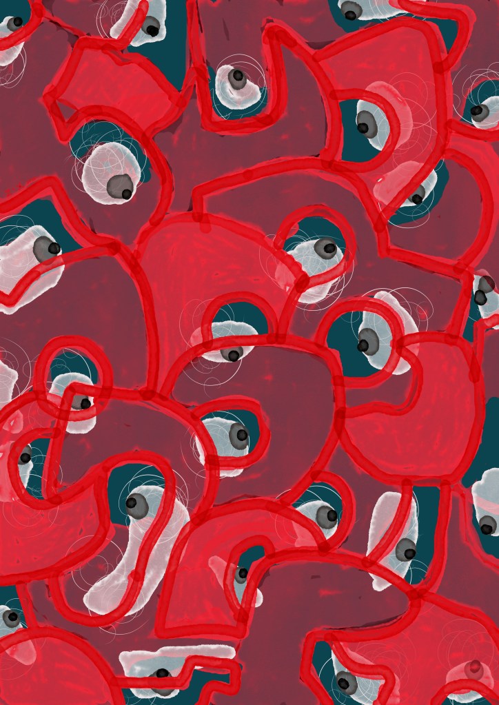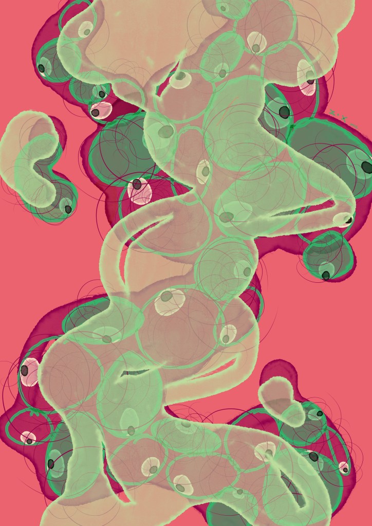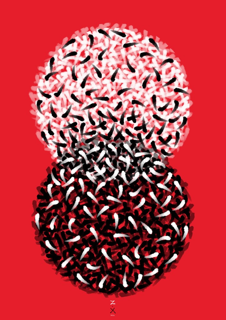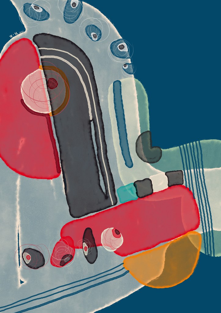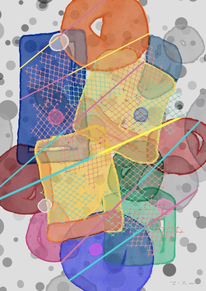 最近创作的《重生》、《繁衍》系列作品主要以鲜明的色块和水墨的多重表现手法对艺术形象和自然对象外观作大幅度偏离的表达。