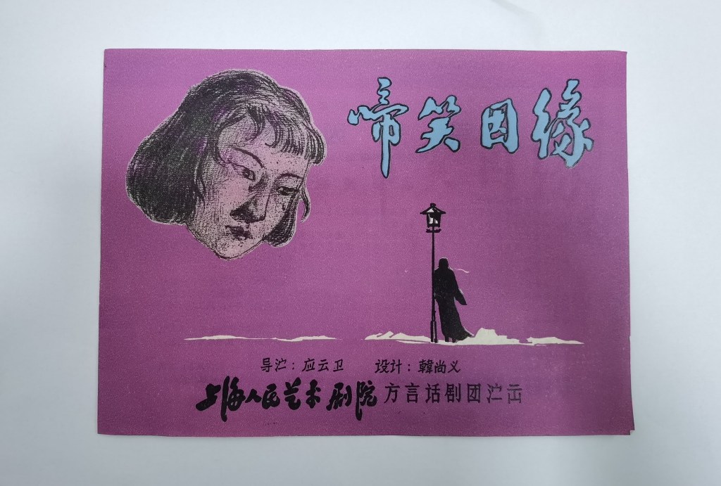 自1962年7月7日起,上海人民艺术剧院方言话剧团在长江剧场连演百余场方言话剧《啼笑因缘》,剧场门前经常出现车水马龙的盛况。这部戏共13场,另有尾声,第七场和第八场之间安排有剧间休息。该剧由苾莎、钱祖武整理,应云卫执导,蒋天一、李明分别担任樊家树AB角,王雪艳、陶醉娟分别担任沈凤喜AB角,唐雯、孙燕玉分别担任关秀姑AB角。这部戏效仿上联剧团剧本,删弃小说中的重要人物何丽娜,突出樊家树、沈凤喜二人间的情感纠葛。十余年前,我在上海文庙淘得该剧两份16开对折页戏单,内容及排版基本一致,只不过一种为黑白版,一种为套红印刷,无太多特色。近两年,我又从网上淘得两种让人眼前一亮的戏单。一种为32开油印本,除封面封底,有内页4页,用钉书针直接装订成册,这种装订手段在我收藏的戏单中绝无仅有。封面上方为剧名,下为套红印刷的一簇花卉;首页主要是《职员表》,并注明演出时段,即1962年7月至10月;第2页至第4页依次为《剧情介绍》《场序》和《演员表》。另一种为大32开横式对折页,其封面经过精心设计,以充满悒郁氛围的紫色为底色,左上方是一位年轻女子的悲凄面孔,凝神注视着右方侧路灯下一名长衫男人瘦小落寞的背影——显然,他们便是被恶势力无情拆散的樊家树和沈凤喜;其内页及封底分别是《故事梗概》《场序》和《演职人员表》,但与前面的油印戏单相比,演员阵容略有调整。正因为该版本的公演获得巨大成功,这之后,国内话剧舞台上的各种版本均脱胎于苾莎、钱祖武改编的这种剧本。