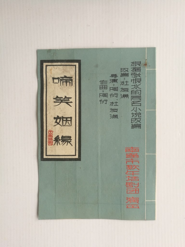 同一时期,南通市歌舞话剧团亦公演《啼笑因缘》。我手头的一份繁体竖排、32开对折页的戏单显示,这部十二场另加尾声的戏剧系杜友渔“根据原小说,参考上海人艺方言话剧团的演出,及北京市曲剧团的台本改编而成”,导演为陶衍、杜友渔,作曲为陶衍,唐水英饰沈凤喜,邵统动饰樊家树,周水英饰关秀姑。该剧严格地说属于话剧,但带有歌舞剧元素。