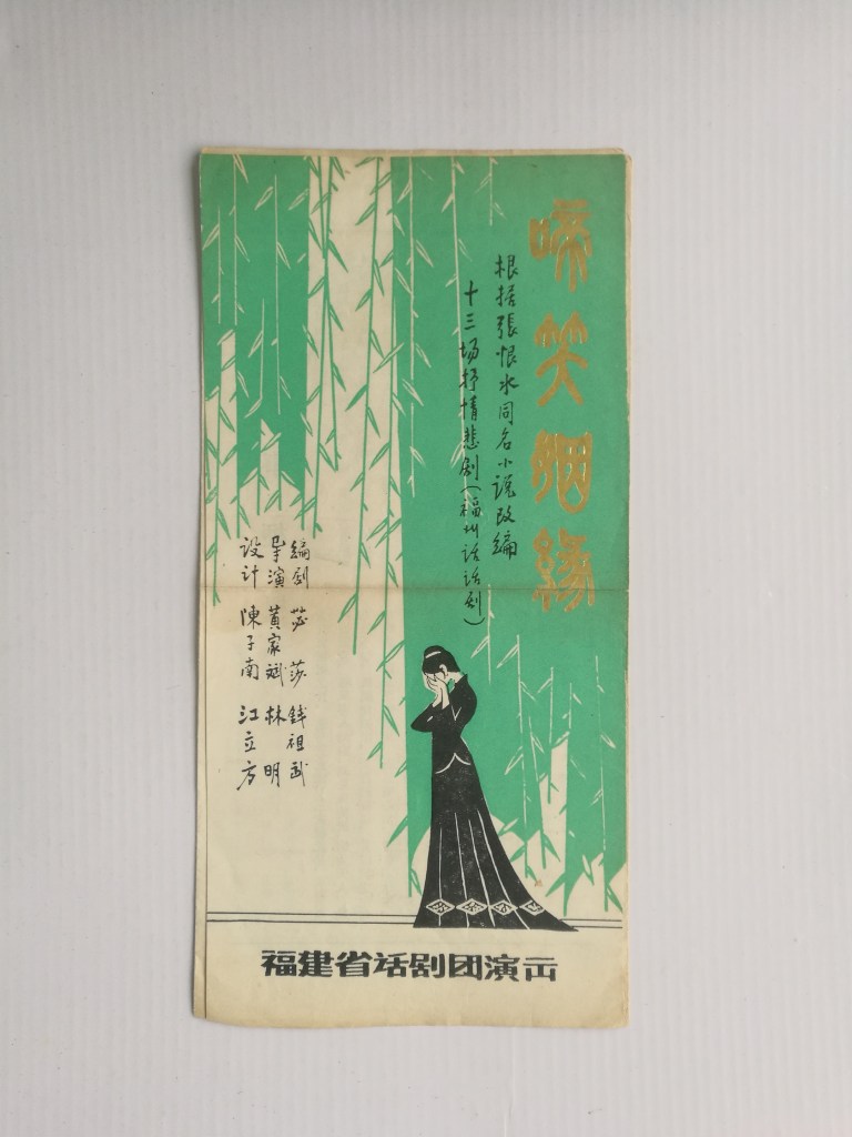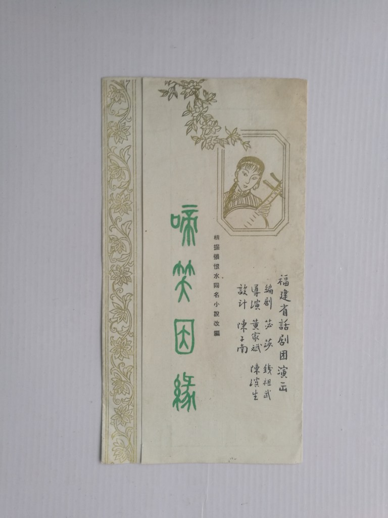 福建省话剧团在“文革”前后两度上演福州话版方言话剧《啼笑因缘》。“文革”前的这份戏单系特殊开本,尺幅为21.5×11cm,三折页。除《演出前言》版块为横排,其余文字均为竖排。其封面设计清新淡雅,乃是以白色为底色,左侧为绿色篆书剧名,上方偏右位置是在一簇盘曲的枝叶下,一位面目清秀的长辫姑娘正凝神弹奏月琴。长达650余言的《演出前言》信息量颇大,介绍福州话版方言话剧的滥觞,披露“为了让不懂福州話的观众也有欣赏‘啼笑因缘’的机会,我们并用普通话演出,以满足广大观众的需要”,并大胆地承认该剧借用的是上海人艺方言话剧团的改编本,同时阐明由于放弃了何丽娜这个人物,“这就确立和进一步突出了沈樊二人单一纯洁的爱情关系,并使这个情节成为剧本的主线,这样也就把由于封建軍阀刘德柱的蓄谋破坏,以至使樊沈二人美好的恋爱成了一场大悲剧的罪恶,揭发得更为深刻,开给以予情的咀咒和鞭鞑!”其演职人员表显示,该剧由黄家赋、陈滨生联合执导,陈玫、徐冰如分任沈凤喜AB角,何钰生、蔡怀玉分任樊家树AB角,王琴如、林照明分任关秀姑AB角。