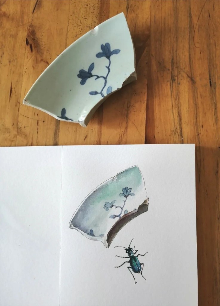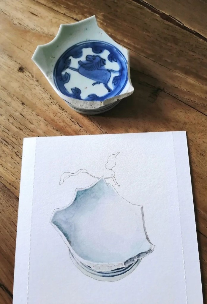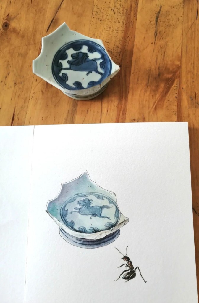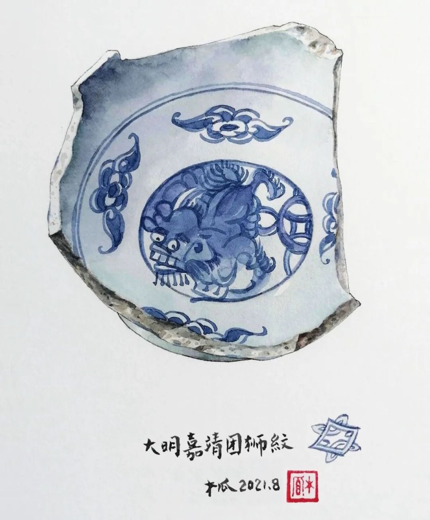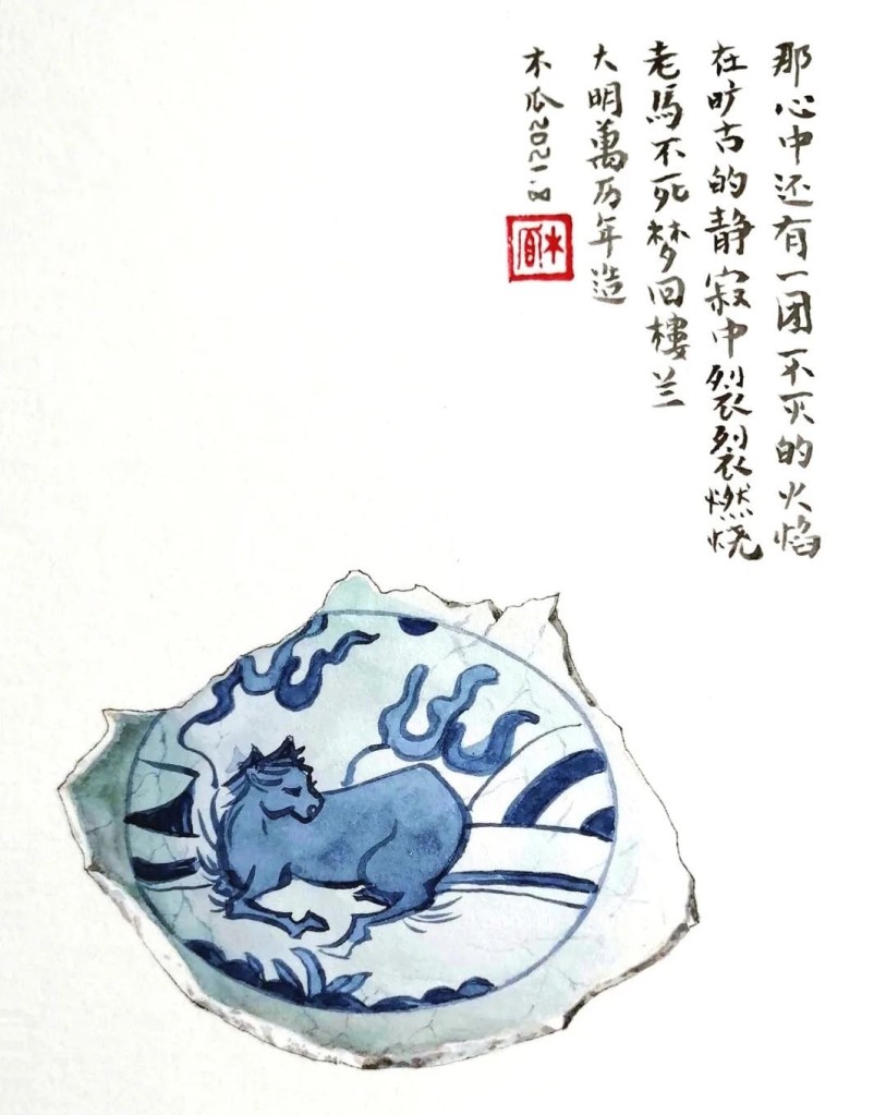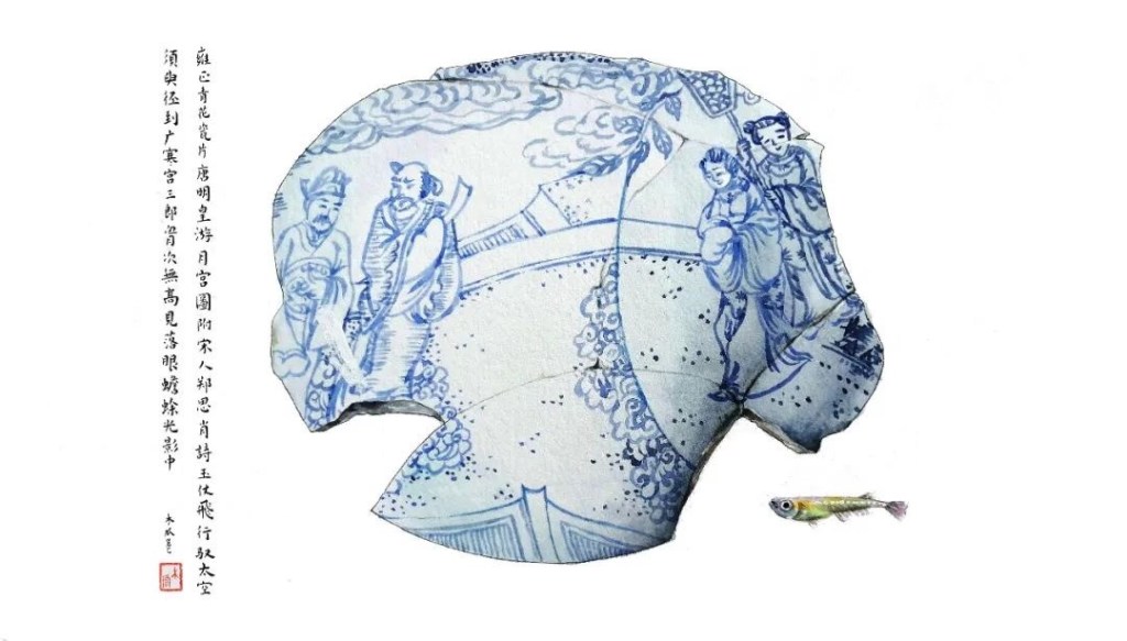 “因为我爱人喜欢收藏,十几年来我耳闻目染。他收藏了许多瓷器,明清瓷器、高古陶瓷都有,还收集了几大箱的瓷器残片。闲来无事的时候,他喜欢擦拭观摩瓷片标本,样子很入神。受他的影响,一段时间我痴迷上画瓷片,我发现瓷片上的图案有一种令人心生宁静的“残缺美”,它不完整,却能真实传达遥远过去的时代信息。于是我画了一个系列。”