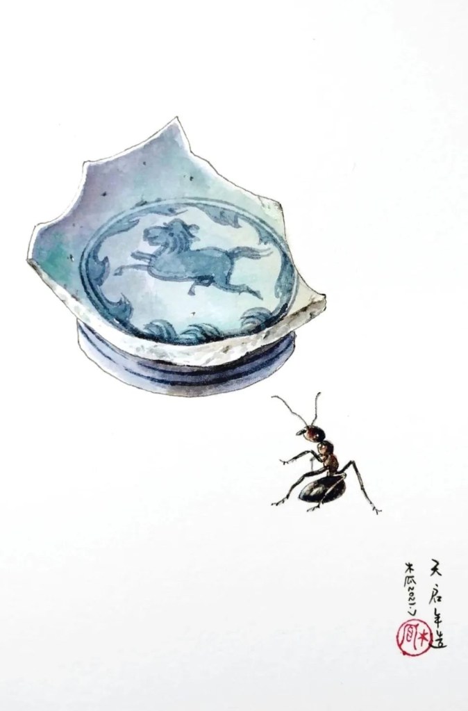只画瓷片略显单薄,添上各种昆虫或是花瓣、枝叶,更显风趣。花草昆虫为生长者,是动;瓷片本没有生命,是静。动静结合,生命力似乎就要冲破画纸。