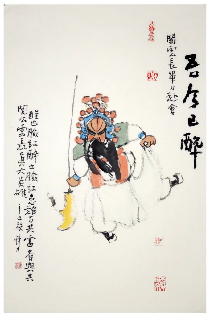 中国戏曲的宽衣大袖、长髯华饰,以及夸张的动作,让笔墨有了驰骋的天地,这是许多画家爱画戏的原因之一。而我除了这些,还喜欢戏曲的色彩,无论脸谱还是戏衣,我舍不得一概用墨取代。尽管中国文人画讲究以墨为主,讲究素雅,但我依然坚持在墨的基础上保留那几笔最靓的色彩。