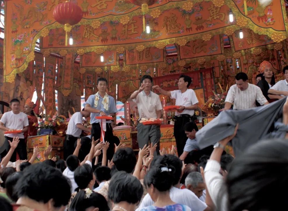 接著,鐘鼓齊鳴,鳥兒被放生,棚上食物被主事者拋下,棚下民眾紛紛爭搶,有用專門準備的以網帕縛於竹竿末端的「孤承」來兜食物的,有用衣服的,有用紙箱的,而徒手而來的人就不免手忙腳亂、顧此失彼,常常在慌亂中「放掉麵桃去搶餅」。