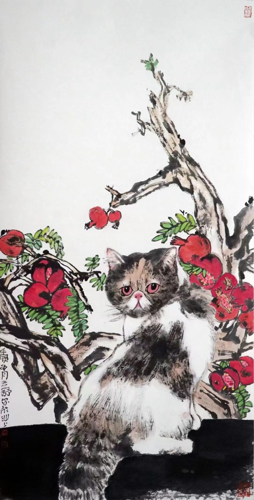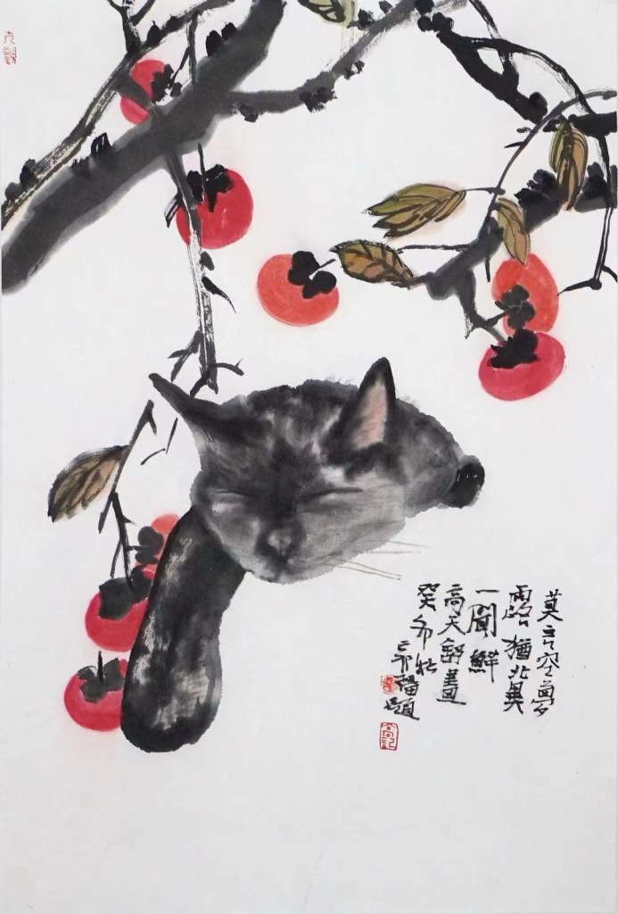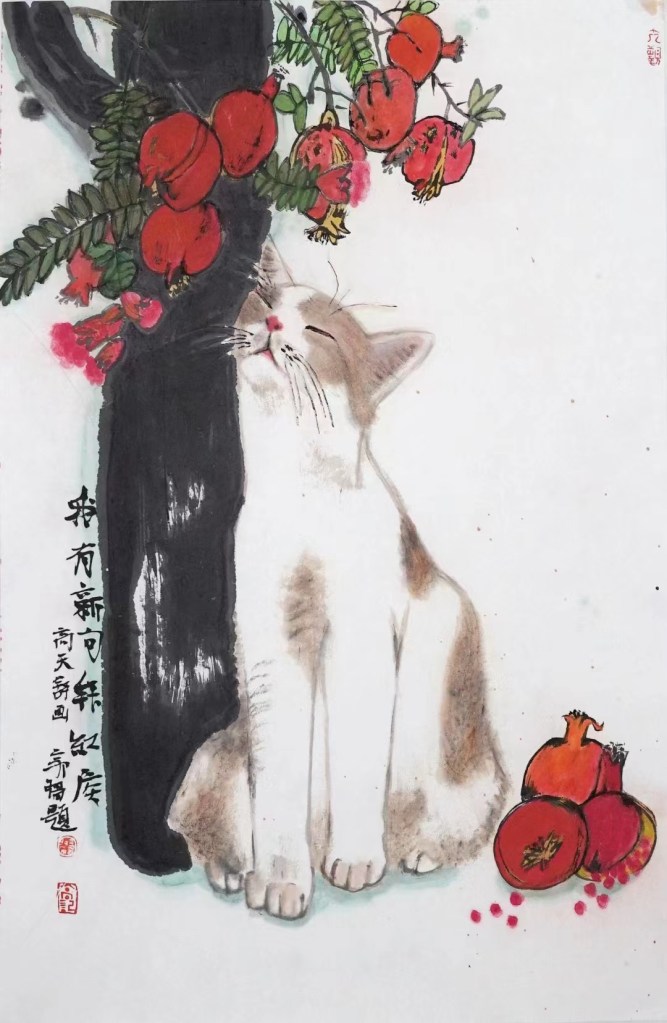 猫流连忘返的石榴是潮汕的石榴,猫爱吃的红目鳞是潮汕独有的鱼饭,但最集中体现潮汕特点的还是这组画作:《拗恼》《灿头鸡》《痴膏》《孬物》《做尼物》《鹤凄夷》《鹤生好》《漏悸》《唔灵精》《乌暗熊》《邋遢》《猫谊》《摆谱》,还有《你尚浪险》《无浪事》《痛过割浪》《我浪》《看了目红》《裸物地个》《来匹》《我逼过火》《老爷保号》《醉到蒙烟》 《惊了着死》 《全街市猎无》《猎猎梭》《你爱烧拍》《死掉好》 《过生雅》《目涩》《雅仔》。命名较为文雅的前 13 幅作品,题名是本地书法家谢佳华,后面若干幅则多是画家任清所题。