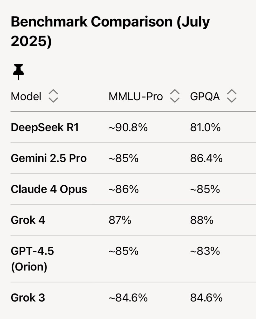 • Limitations: Static benchmarks (e.g., MMLU-Pro, GPQA) risk overfitting, and X posts may exaggerate claims (e.g., Grok 4’s “nuts” performance). I’ve cross-verified with official sources where possible.