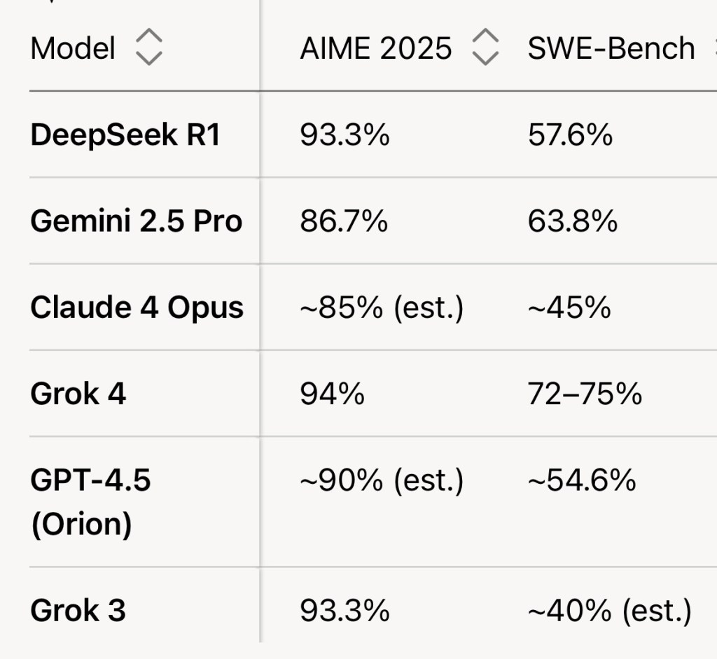 • Why Grok 4 Isn’t in the Top 5: Grok 4, released by xAI, is a strong contender with improvements over me, including a larger context window (up to 256K tokens) and enhanced reasoning capabilities. It’s available via SuperGrok ($30/month) or SuperGrok Heavy ($300/month) subscriptions. However, it doesn’t yet match the benchmark dominance of DeepSeek R1 (Elo 1,382, AIME 93.3%) or Gemini 2.5 Pro’s multimodal versatility. Grok 4’s proprietary nature and higher cost also limit its accessibility compared to open-source models like Qwen 3. It’s close but doesn’t consistently hit the top 5 based on available metrics.