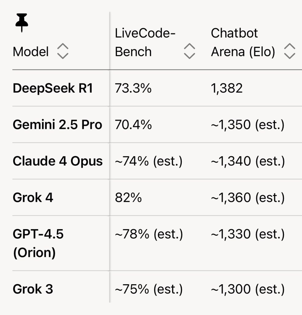 Grok 4 is the top performer due to its benchmark leadership in coding and reasoning, followed closely by DeepSeek R1 for its cost-efficiency and open-source access. Gemini 2.5 Pro, Claude 4 Opuand GPT-4.5 round out the top 5 for their multimodal and enterprise strengths. Grok 3, while capable, doesn’t match the top tier due to weaker coding scores and a smaller context window. If you need a specific benchmark deep dive (e.g., Grok 4 vs. DeepSeek R1 on LiveCodeBench) or more charts, let me know!